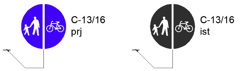 Znak C-13/16a „droga dla pieszych i rowerów” stosuje się jeżeli droga ta rozdziela się na dwie osobne drogi przeznaczone jedna dala rowerów, druga dla pieszych.
